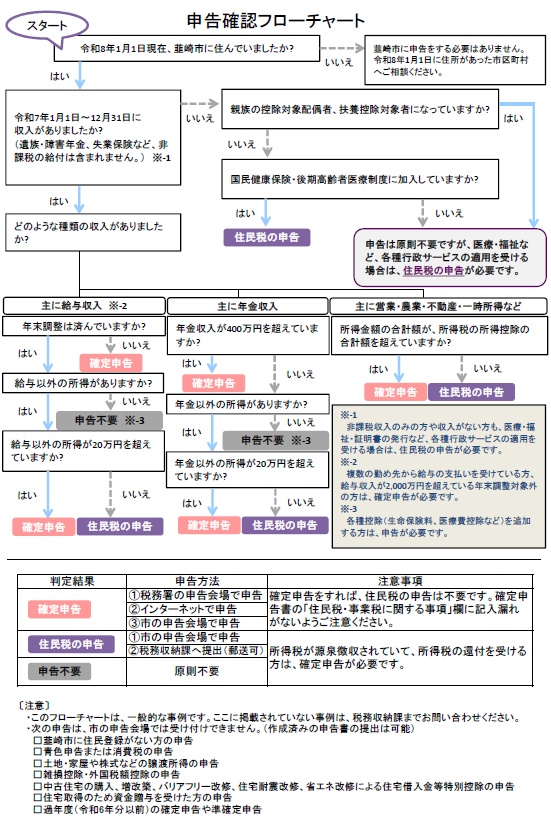 収入の種類や年金の額、無収入だった場合など、様々な条件により、確定申告(所得税の申告)や住民税申告(市県民税の申告)が必要になります。