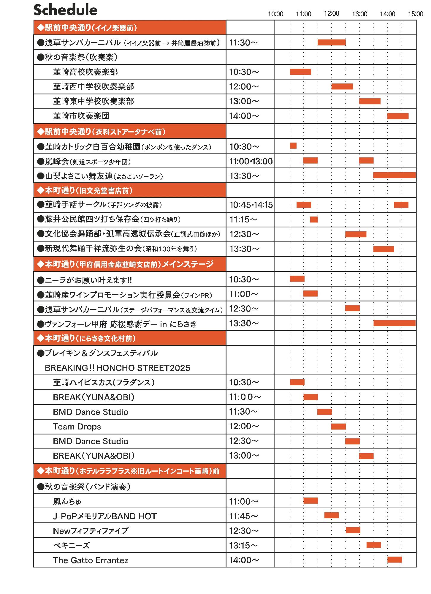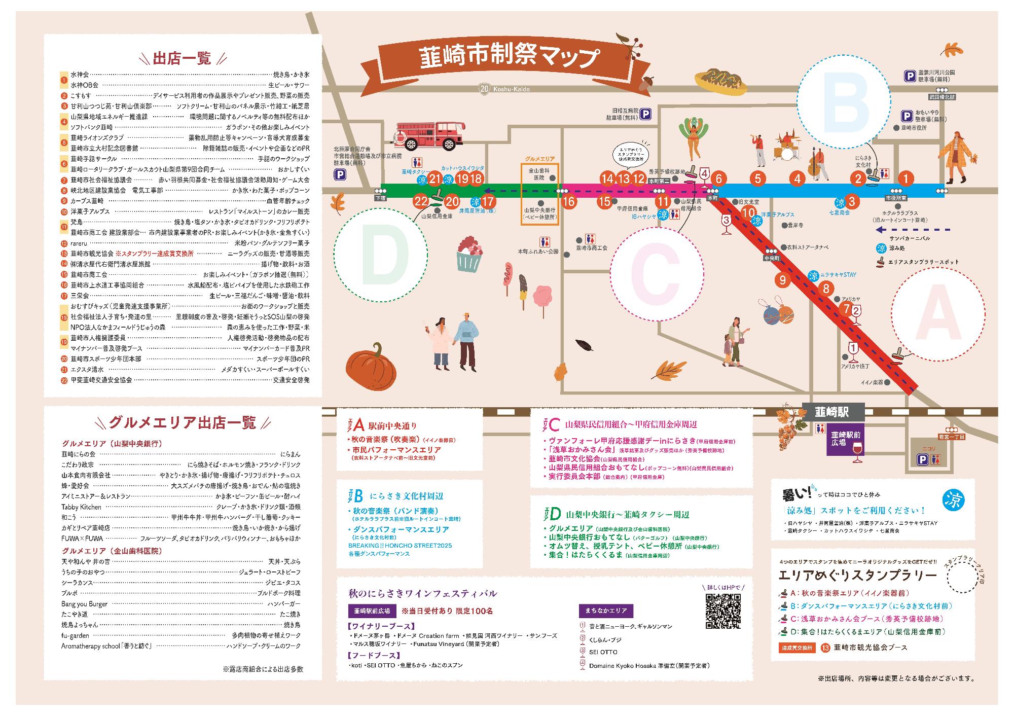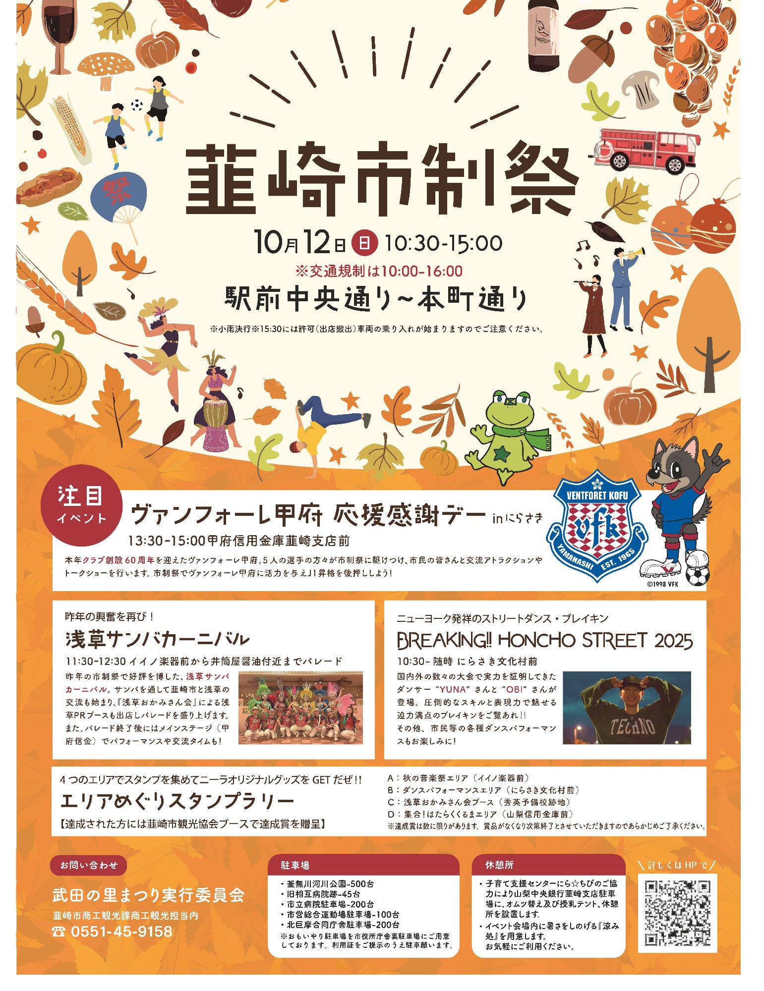 昨年に引き続き本町通り及び駅前中央通りをメイン会場とする「まちなかエリア」を会場に韮崎市制祭を開催いたします。「喜びや感動を共有する」、「見るから参加する」をコンセプトに子どもから大人までが楽しめるイベントを実施します。舞踊やダンス、音楽、伝統芸能など、市民の方々が日頃の練習の成果を披露し、市民総参加で市制祭を盛り上げていきますので、ぜひ、ご来場ください!