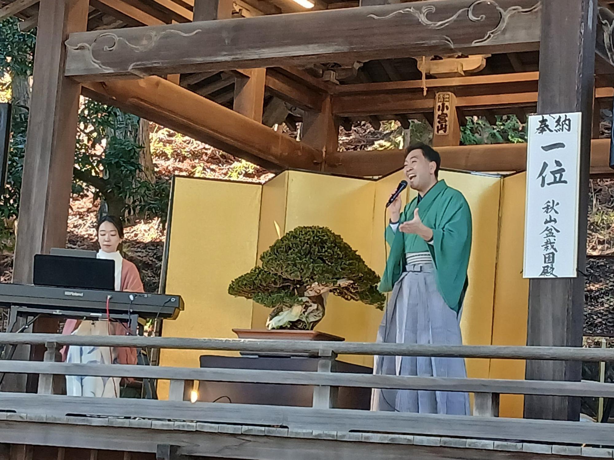 晴れ渡る2026年の元旦に、韮崎市にあります若宮八幡宮の神楽殿で新春コンサートが行われました。出演者は童謡歌手の若林秀和さんとピアニストの青木陽香さん、展示では盆栽師の秋山実さんの一位の盆栽が展示されました。誰もが口ずさむことができる童謡を中心に20分ほどのコンサートが2回に分けて行われました。