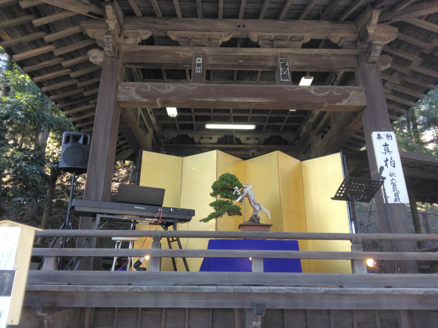 奉納者は盆栽作家の秋山実さん、書道家の田中志津さん、同じく書道家の丸山司さん、華道家の牛山二美子さんの展示が神社の境内に並び、昼間と夜のライトアップした姿と二度楽しめる内容となっていました。