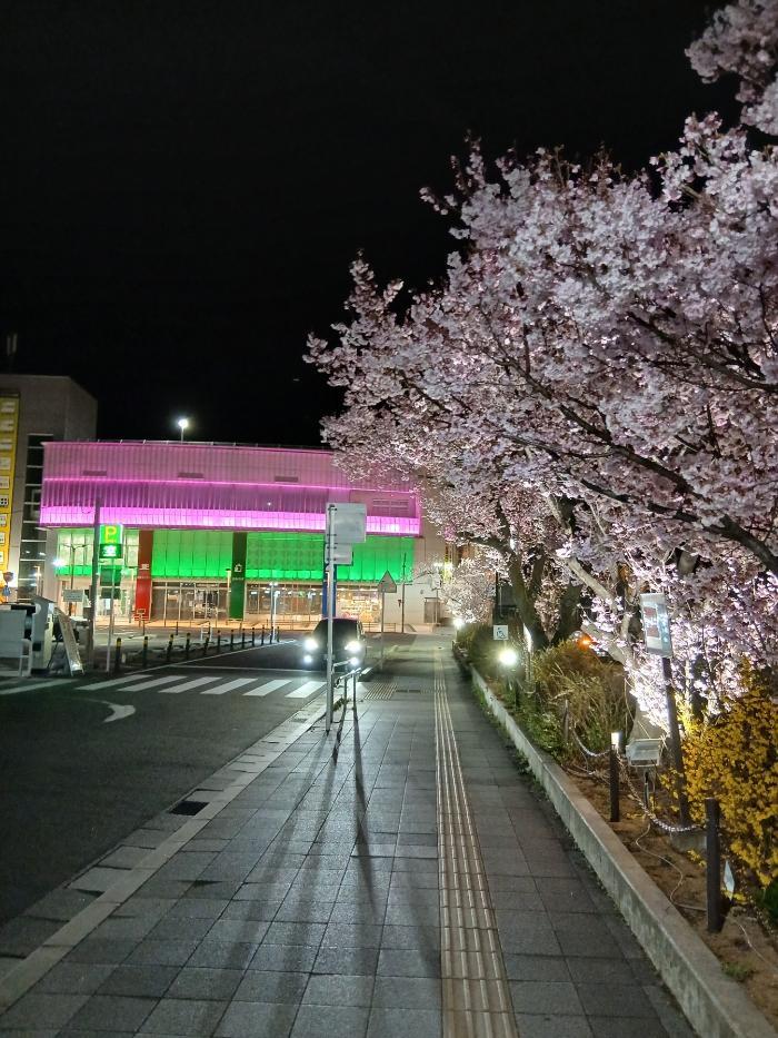 韮崎市民交流センターニコリと韮崎駅の明かりが重なって、とてもきらびやかな情景となっています。昼間とは雰囲気が少し違う、韮崎市内では1番最初に開花する桜の花を見て思い出作りにお出かけしてみてはいかがでしょうか。